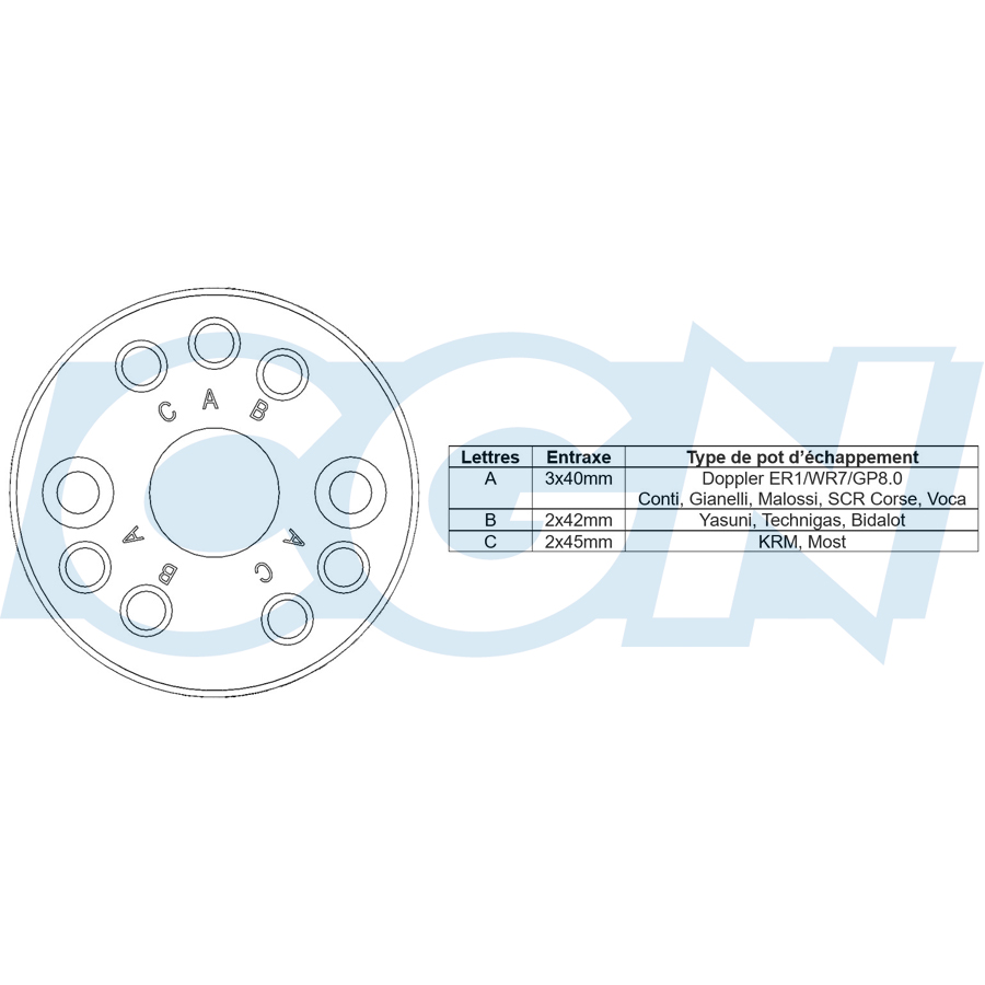 | Lettres | Entraxe* | Type de pot d'échappement |